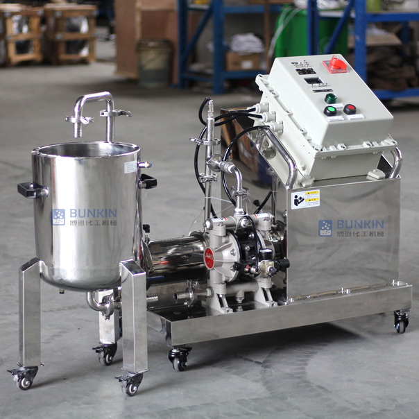 实验室中试卧式砂磨机的隔膜泵将喂料斗内的物料与研磨腔形成循环研磨。研磨腔内填充研磨介质受到拨盘旋转带动产生各个方向的力并不规则运动,物料中的颗粒受到研磨介质不断的碰撞及摩擦,同时,筛网使物料和研磨介质分开,物料不断的从料斗罐到研磨腔循环流动,实现粒径变小,粒径范围变窄的目的。